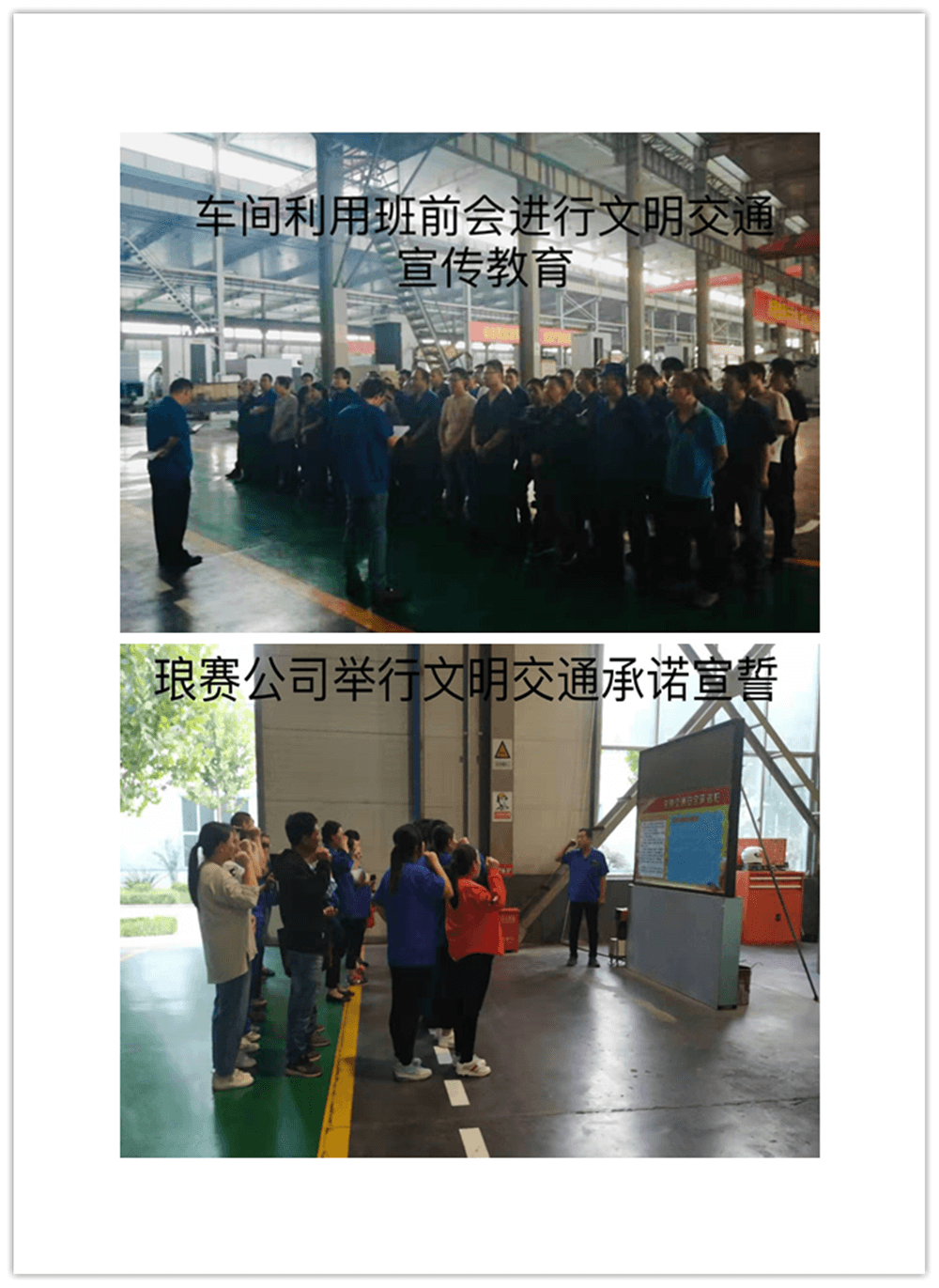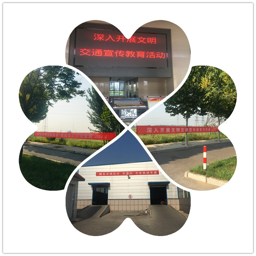 懸掛文明交通宣傳標(biāo)語,營造濃厚的宣傳氛圍。公司在廠區(qū)門口對面及存車棚外等懸掛文明交通宣傳教育標(biāo)語,使員工在上下班路上抬頭就可以看到醒目的標(biāo)語,特別是在存車棚處時刻提醒員工“騎車不闖紅燈、不逆行、不走機(jī)動車道”。通過懸掛標(biāo)語,營造了濃厚的文明交通宣傳教育氛圍。