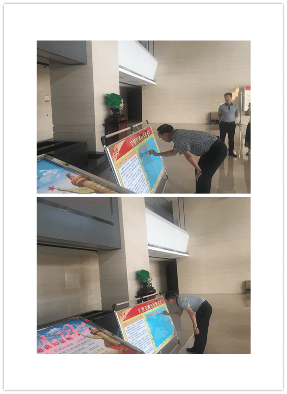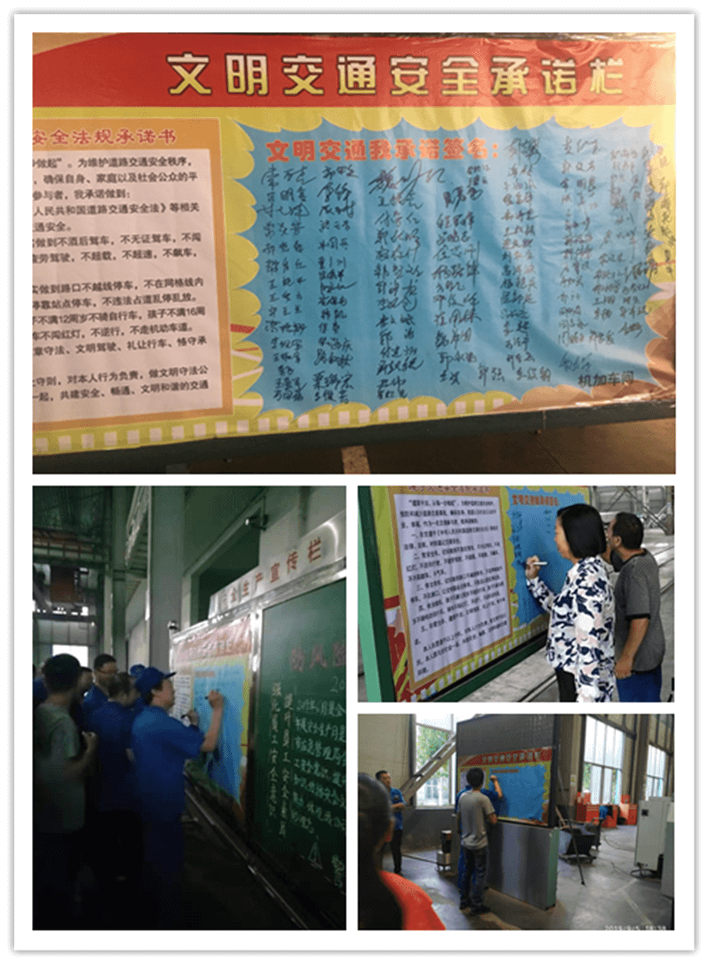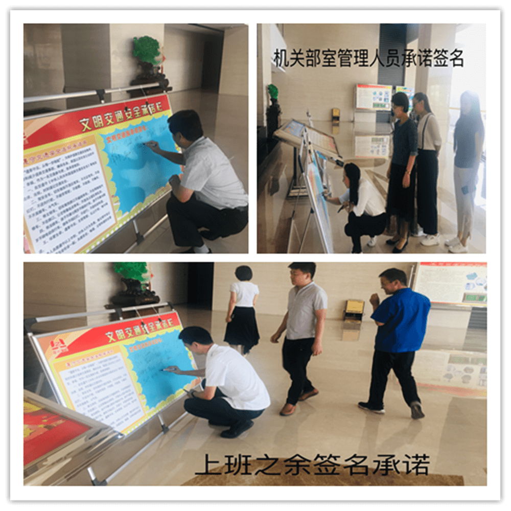 簽訂“遵守交通安全法規(guī)承諾書”。公司制作了“遵守交通安全法規(guī)承諾欄”版面十余塊,擺放在醒目位置,以部門為單位,每位員工在版面上進(jìn)行簽名承諾。公司總經(jīng)理郭釧帶頭在《文明交通承諾欄》上簽名,其他領(lǐng)導(dǎo)和部門員工也陸續(xù)進(jìn)行了簽名,通過交通安全承諾簽名,使每位員工時刻提醒自己,履行自己承諾。